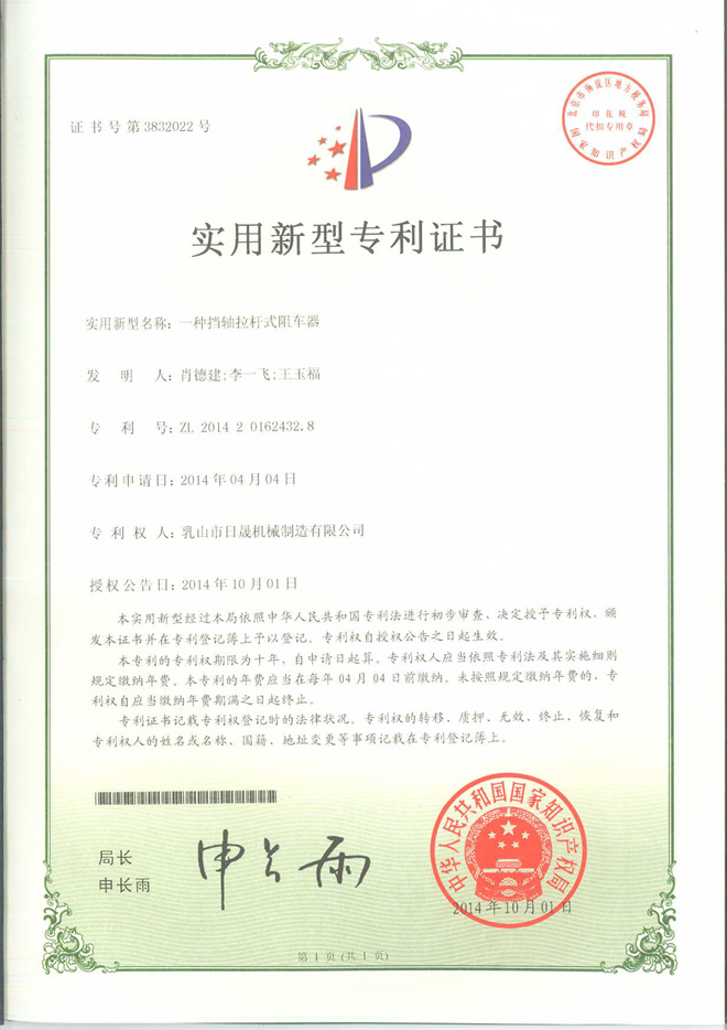 Patent certificate----Block shaft rod retarder